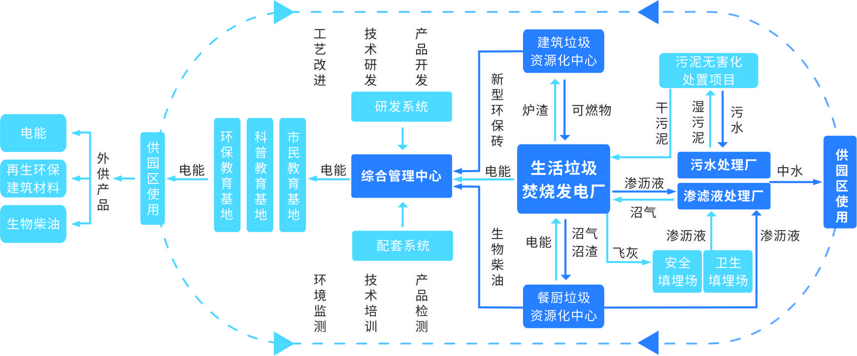 BB贝博艾弗森环境循环经济产业园模式以生活垃圾焚烧发电厂为园区核心,统筹各类生活垃圾处置中心的配套建设,对各类生活废弃物进行无害化、减量化、资源化处理,输出电能、建筑材料、生物柴油等副产物,为园区生产、生活提供服务。